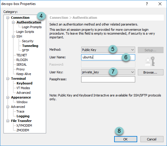 vagrant ssh-config" to get the path of private key. - Click "OK" to finish.